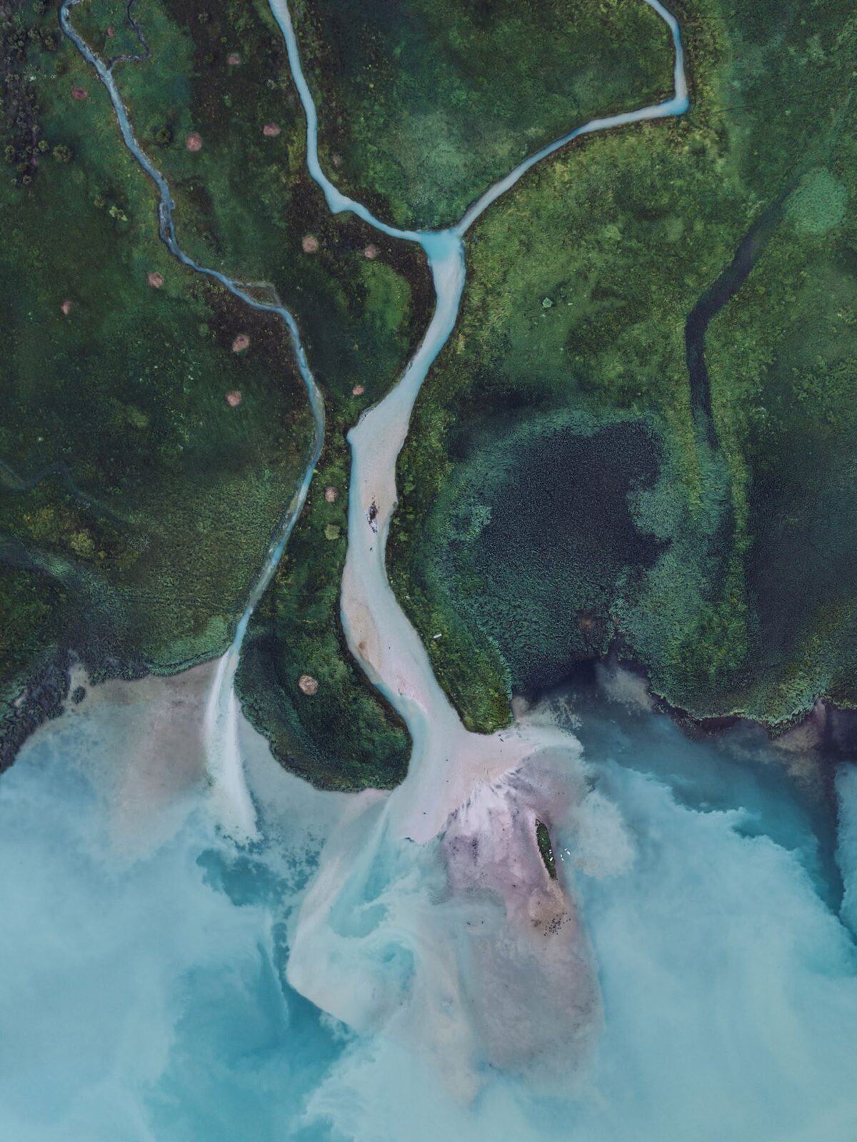 Jezioro w Południowym Tyrolu, do którego wpływa rzeka tworząc takie ciekawe kształty – widziane okiem drona.