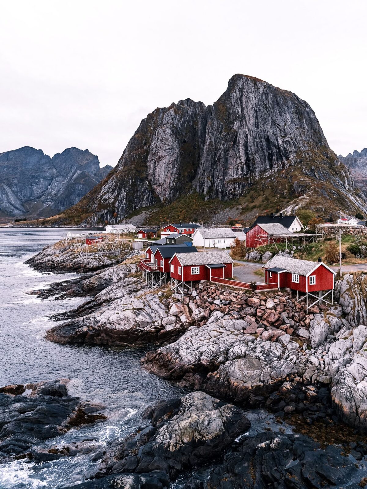 Czerwone domki rybackie i majestatyczne góry w tle – to jeden z najsłynniejszych widoków na Lofotach. Za każdym razem gdy tamtędy przejeżdżaliśmy spotykaliśmy grupkę fotografów polujących na ujęcia z tego miejsca.