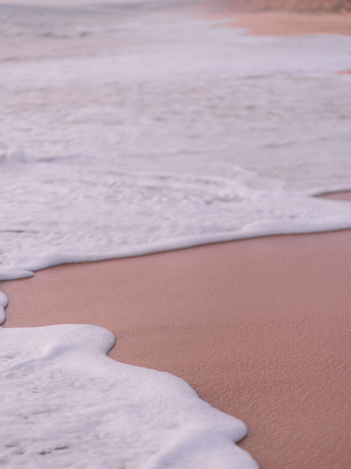 Minimalistyczne zdjęcie morskiej piany i różowego od zachodu słońca piasku.
